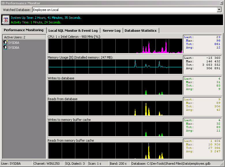 It includes modules such as Performance Monitoring: displays user logins, host system CPU usage, memory usage of the monitored database, number of writes and reads to the database and cache, local SQL monitor and Event Log where internal events are displayed (e.g. lost connection and resume activity ) and all commands run on the local machine using an application written using FIBPlus. Server Login: this module can display the server log file. Database Statistics: here you can have the database statistics listed.