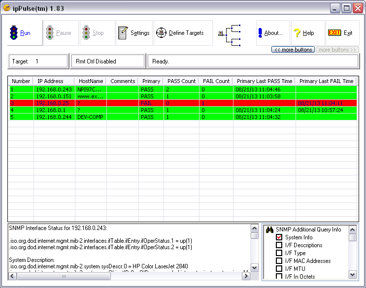 ipPulse is an application that can monitor network devices to get notifications about connectivity problems. It tests the connectivity of IPv4 devices (computer, router, switch, printer) in any IPv4 network. There are several tests to choose from. The primary test consists of pinging the target device and waiting for a response, or connecting to a TCP port. The secondary test has multiple modes. With these, you can connect to a TCP port to verify the connection, use SNMP (v1, v2c) to detect network interface problems, verify the web server status code, or check the visibility of a particular text string on a page.
