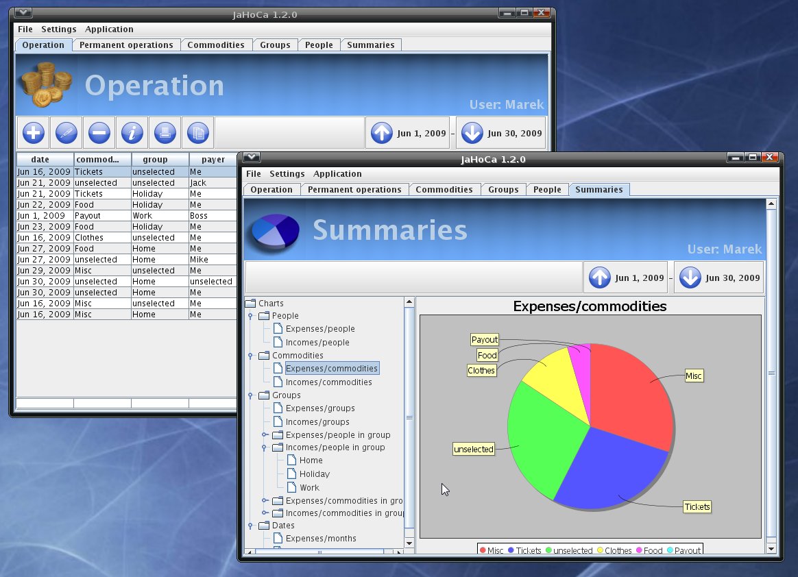 JaHoCa (Java Home Cash) is an application used to keep track of home finances. The program allows you to manage multiple user accounts. The user is provided with a simple environment to keep track of their cash transactions (income and expenses), along with other additional information. The overview of individual transactions can be filtered by period, printed or exported to PDF.