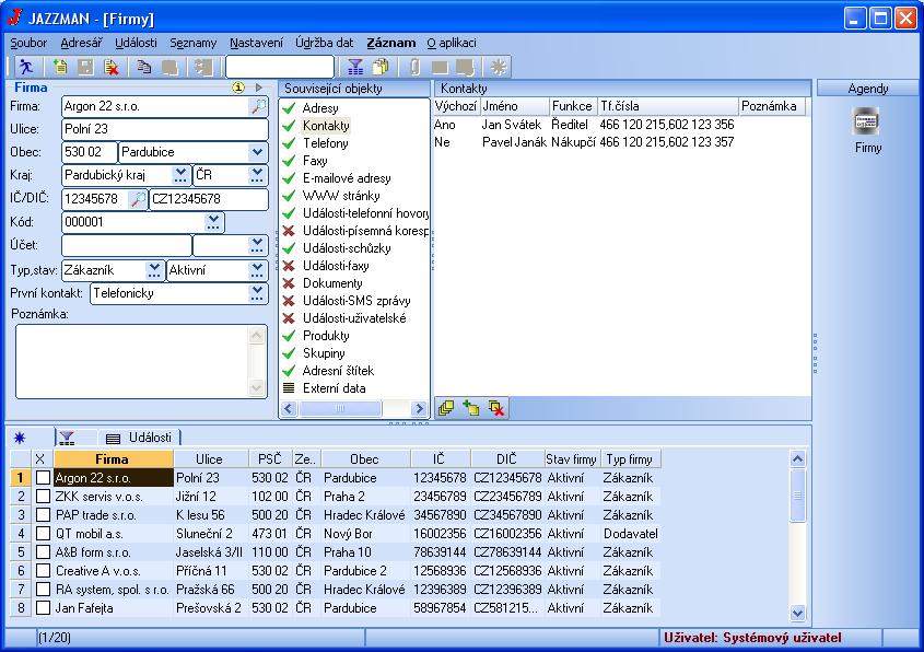 The application includes support for mass communication (sending business messages by e-mail, printing address labels, ...). Of course, there are functions to display people whose birthday or holiday falls on a given day. If the company has the necessary data in another database, it is possible to create data connections that will make them available to users within the Jazzman CRM system.