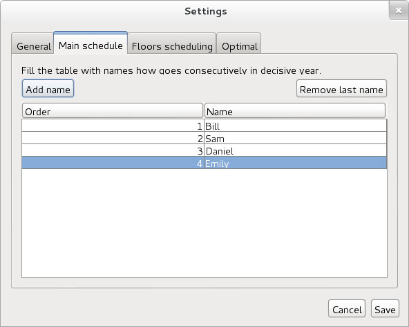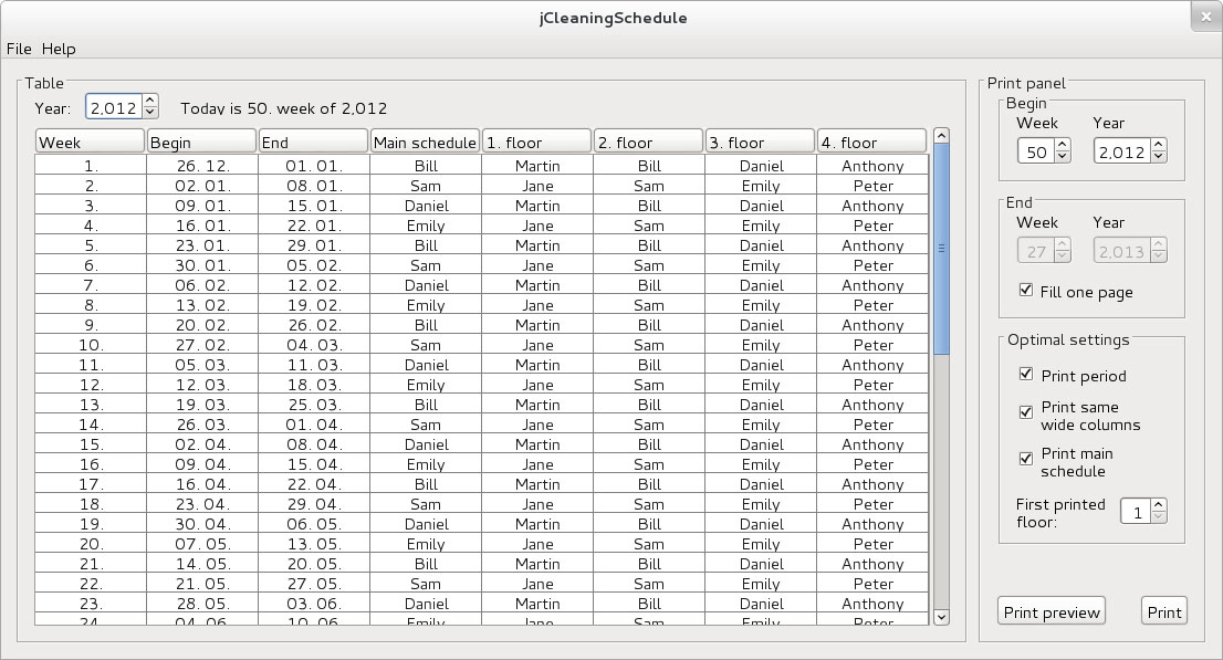 jCleaningSchedule is a program for printing and managing home cleaning schedules. The program generates a printable spreadsheet that lists, for each week, the people who should be doing floor duty that week, as well as the person who should be doing the main (common) duty that week.