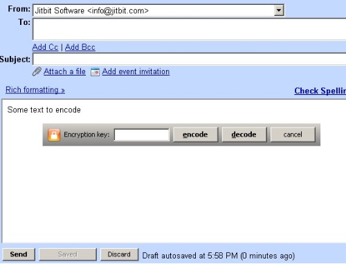 JitBit Enkodr is one of the simplest encryption tools for text encryption. It works in conjunction with various text editing programs: MS Word, MS Outlook or even GoogleMail or Yahoo webmail.