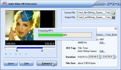 You can choose to extract the whole file or just a certain part of the video thanks to the integrated preview. The application can also handle ID3 tags, these can come from the video files information or manually inserted. Thus, you can easily cut and save to disk entertaining interviews from some shows, or favorite songs from movies or any other audio information from video files.