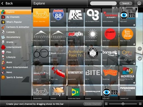 Joost TV's content is sorted into thematic channels, which are always grouped under a specific category. You will find categories focusing on music, entertainment, sports or news and more.