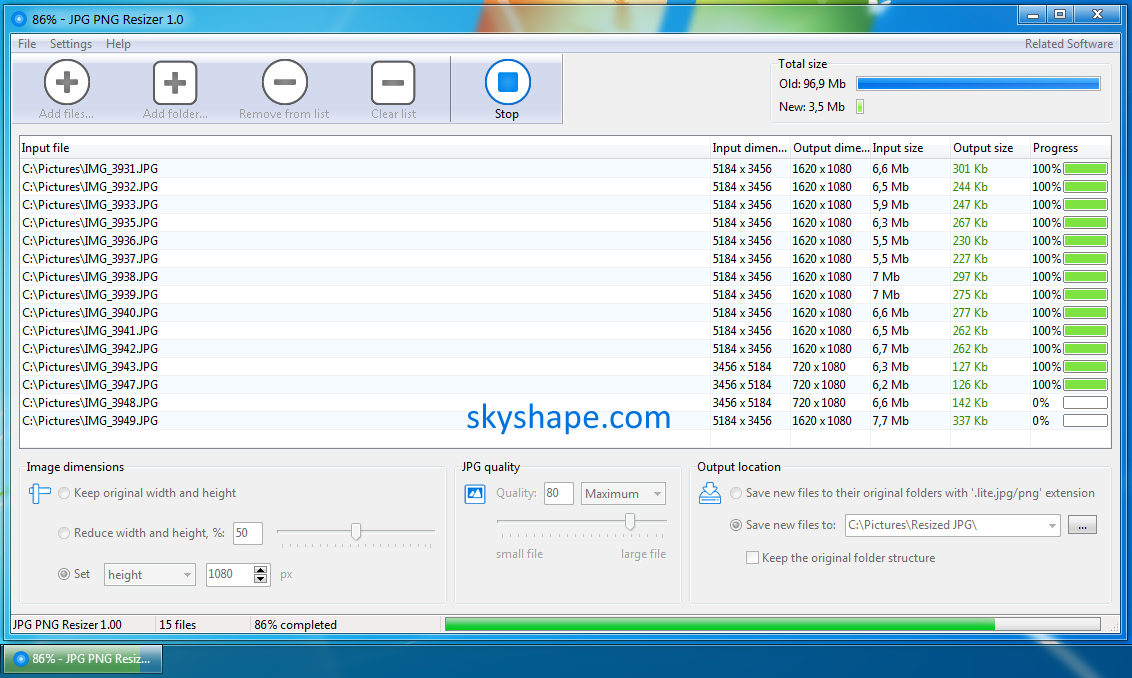 JPG PNG Resizer is a software designed to make resizing images easier and faster. Add multiple files or even an entire folder of images and resize them in seconds. Just select the target folder and click the "Start" button!