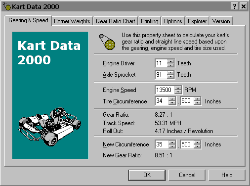 Kart Data 2000 is an application that will calculate various kart chassis settings, including gear ratio, track speed or weights, based on the information you enter.