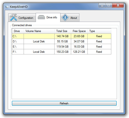 KeepAliveHD is a utility that prevents a hard drive from automatically going to sleep. The tool includes a multi-disk management program. It prevents the transition by recreating a very small text file at periodic intervals. Writes can be made after a certain number of seconds, minutes or hours. The utility provides information about each disk drive and lists its name, total capacity and space, and type.