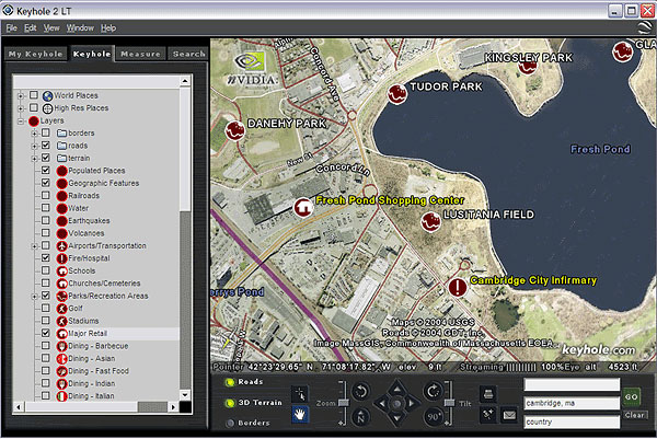 Want to see exotic locations such as Maui, Tokyo, Rome or Paris? You can also explore details like restaurants, hotels, parks and schools. The program downloads images taken from an Internet database to simulate a satellite from space, and has over 12 terabytes of images stored. Everything can be tilted, rotated and zoomed in.