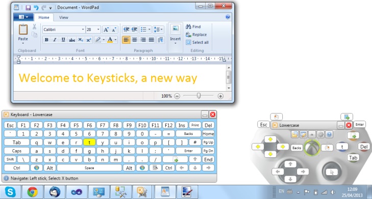 Using Keysticks with a wireless game controller means you don't have to sit at your computer. You can control your music player wirelessly. You can also connect your computer to your TV and browse the web wirelessly using a web browser. Keysticks comes with ready-made profiles for Windows control and a virtual keyboard with word prediction.
