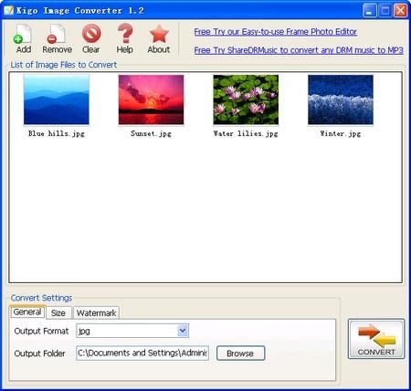 Kigo Image Converter is a convenient file conversion tool. It allows you to convert graphic files of popular formats, resize and watermark digital photos and images.