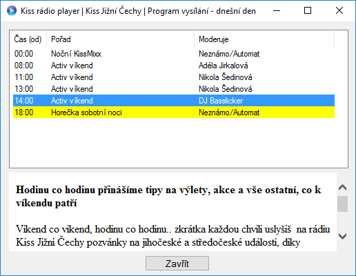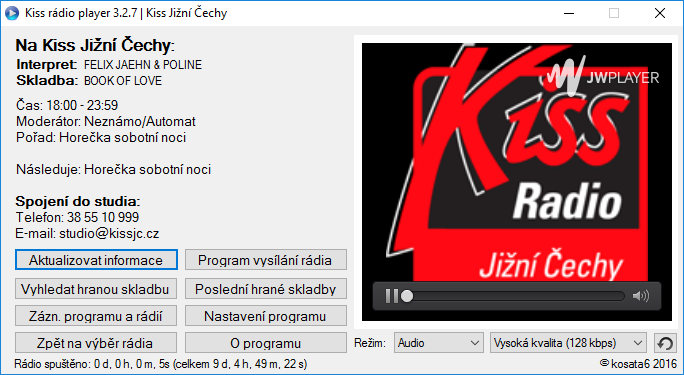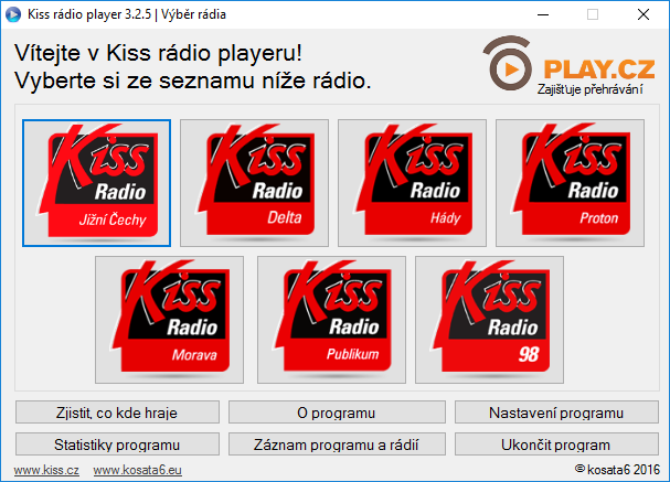 The Kiss radio player program supports all Kiss radios - South Bohemia, Delta, Hády, Proton, Morava, Publikum, 98.