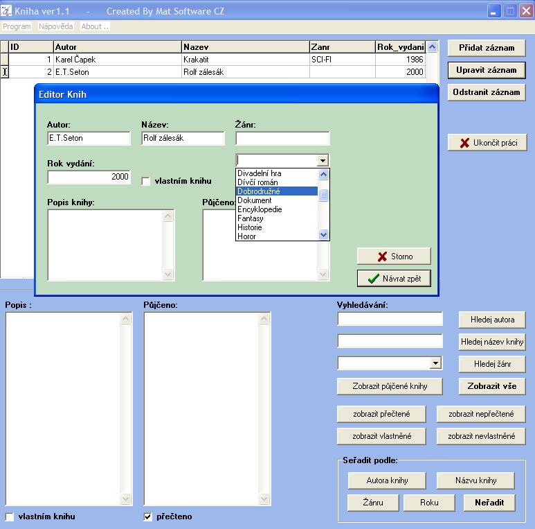 Simple database application for clear management of your library. The program has a simple control which is easy to navigate. It is used to keep a clear record of your books in the library or as your personal reading diary. It allows you to record whether a book is in your personal possession, whether and when someone borrowed it, and the possibility of inserting your own notes (e.g. a brief plot or your rating). Books can also be sorted by genre, of course. There is also the possibility to print according to the desired criteria.