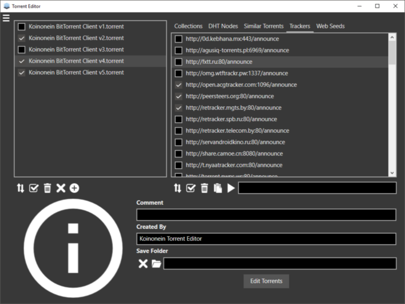 The Koinonein Torrent Editor will eventually bring you a list of working and verified trackers to use with your torrents.