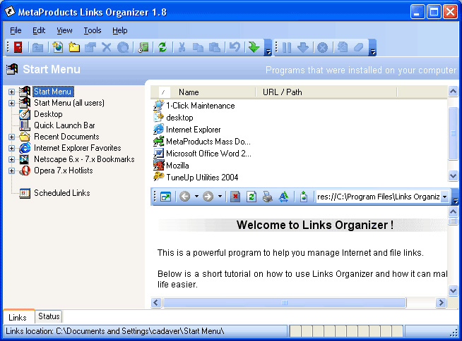 Links Organizer is a Windows program that has been developed for quick access to most types of links on your system. Use it to view, edit and change links between categories. It can also verify and remove invalid ones and update them. The new version allows you to search for duplicate files or links.