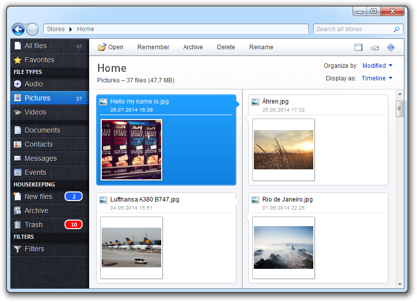 liquidFOLDERS is a revolutionary way to manage all the files and folders on your computer. With this tool, you can access all your files without having to endlessly browse the system looking for a specific item. The left panel allows you to access specific files and folders (e.g. music, pictures, videos, documents, contacts, messages, events). The tool also includes a filtering function. An important feature is the creation of so-called Stores, which unlink to selected directories.