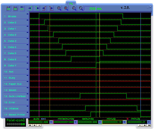 You can scan the LPT port manually using the spacebar or automatically by entering the scan period time and using the enter key to start the process. Pressing the enter key again will terminate the scanning process and display the data read from the serial port. You also have the option to search the data, looking for the leading or trailing edges of a particular PIN or PIN group, either forwards (with increasing time) or backwards. You can then save the data to disk in binary or text form. For easier analysis, there is a magnifying glass and four tabs in which you can save the selected location and use this to measure how long a particular segment took. Right-clicking over the samples brings up a context menu where you can save and load data from a file. The program analyzes the data during the loading process and if it decides that it does not know the format being loaded, it deletes all samples saved so far from memory and stops processing the file further.