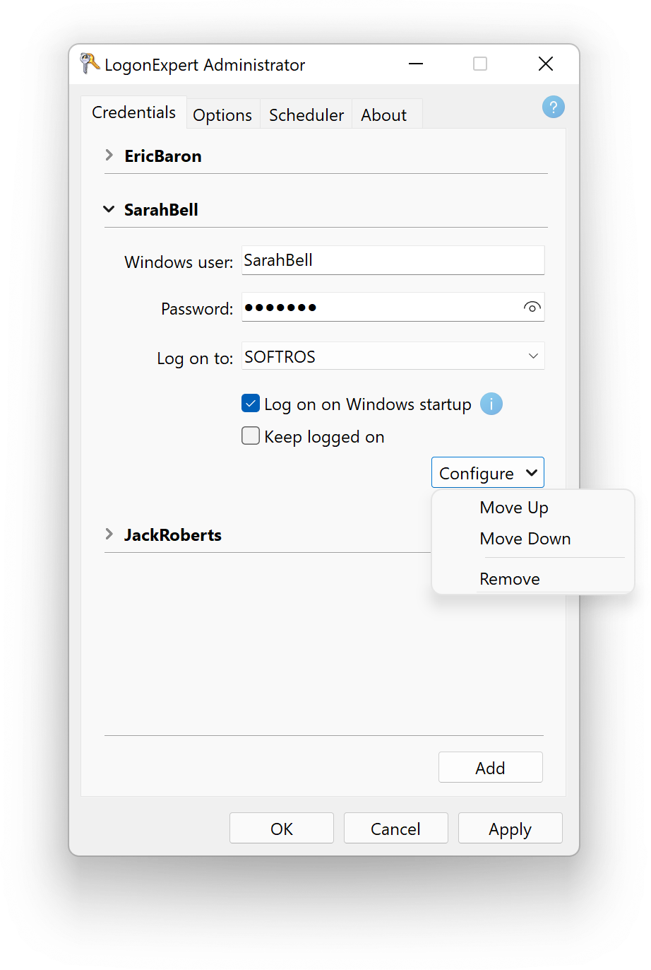 LogonExpert gives you the option to set user login credentials by selecting the desired user account with username and password details.
