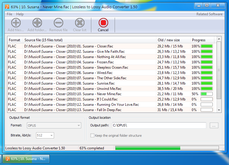 You can import the contents of an entire folder and delete selected files or clear the entire list with a single click. The tool reveals information about each track, such as format, file path, old/new size and progress of the conversion task.