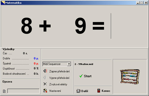 In the program you can set up addition, subtraction, multiplication, division, counting with and without zero, range of counted numbers, mixing of operands, generation of examples with positive result only, generation of examples with possible editing and printing, music, sound and graphic effects, display of error examples, etc.
