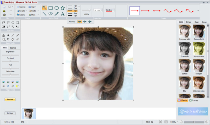 It works with many graphic styles (e.g., arrows, lines, rectangles, polygons, arcs, text, bitmap objects) and various processing effects (e.g., mosaic, coloring, highlighting, zooming, warping, light enhancement, blurring, softening, focusing, denoising, grayscale, black and white), while supporting selection, gradient, fill, crop, resize, watermark, etc.Maymeal PicEdit offers a useful set of functional image editing tools for both beginners and more advanced users and photographers.