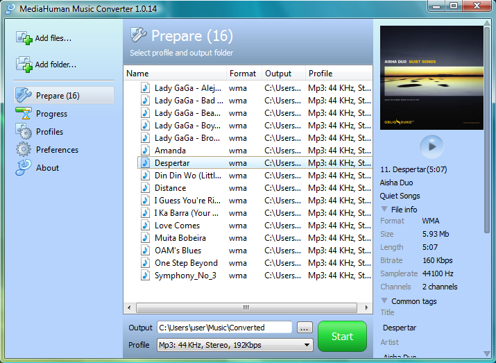 MediaHuman Music Converter is a software developed to convert music tracks (WMA, M4B, M4P) to the most commonly used formats such as MP3, OGG, WAV. It's especially useful if you have songs purchased from an online music store and want to listen to it on playback devices that don't support its format. The process of converting your music is very simple: launch the program, select the desired output format and output folder and press the "Start" button. Batch conversion is supported.