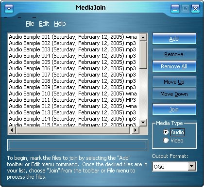 This program allows you to combine audio and video formats to create a merged audio or video file. It supports MP3, WMA, WAV, OGG, AVI, MPEG-1, MPEG-2 and WMV formats.
