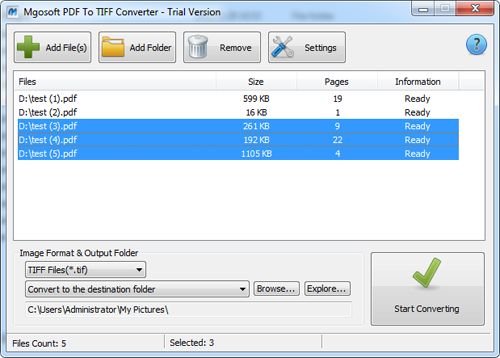 Mgosoft PDF To TIFF Converter is a fast way to convert in batch conversion without quality loss PDF files to TIFF, TGA, PNG formats. It preserves the layout, color, formatting from the original PDF file. You can adjust image quality, color filter, image resolution, etc.
