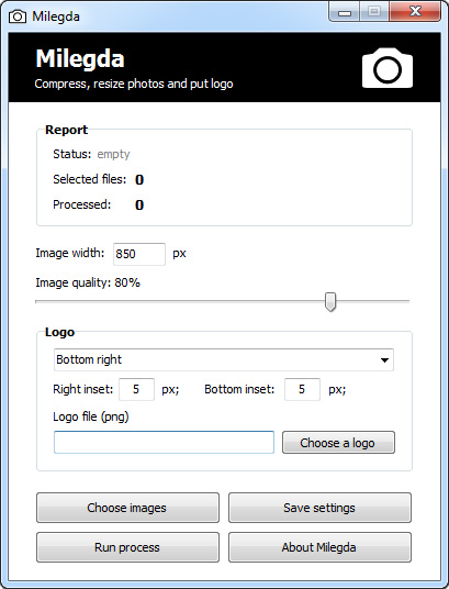 Milegda is an application designed to optimize JPEG images. It can adjust the size of images in pixels and apply logos or labels. Image compression can significantly reduce the physical file size, making it easier to reshare images. The use of watermarking will guarantee the protection of images.