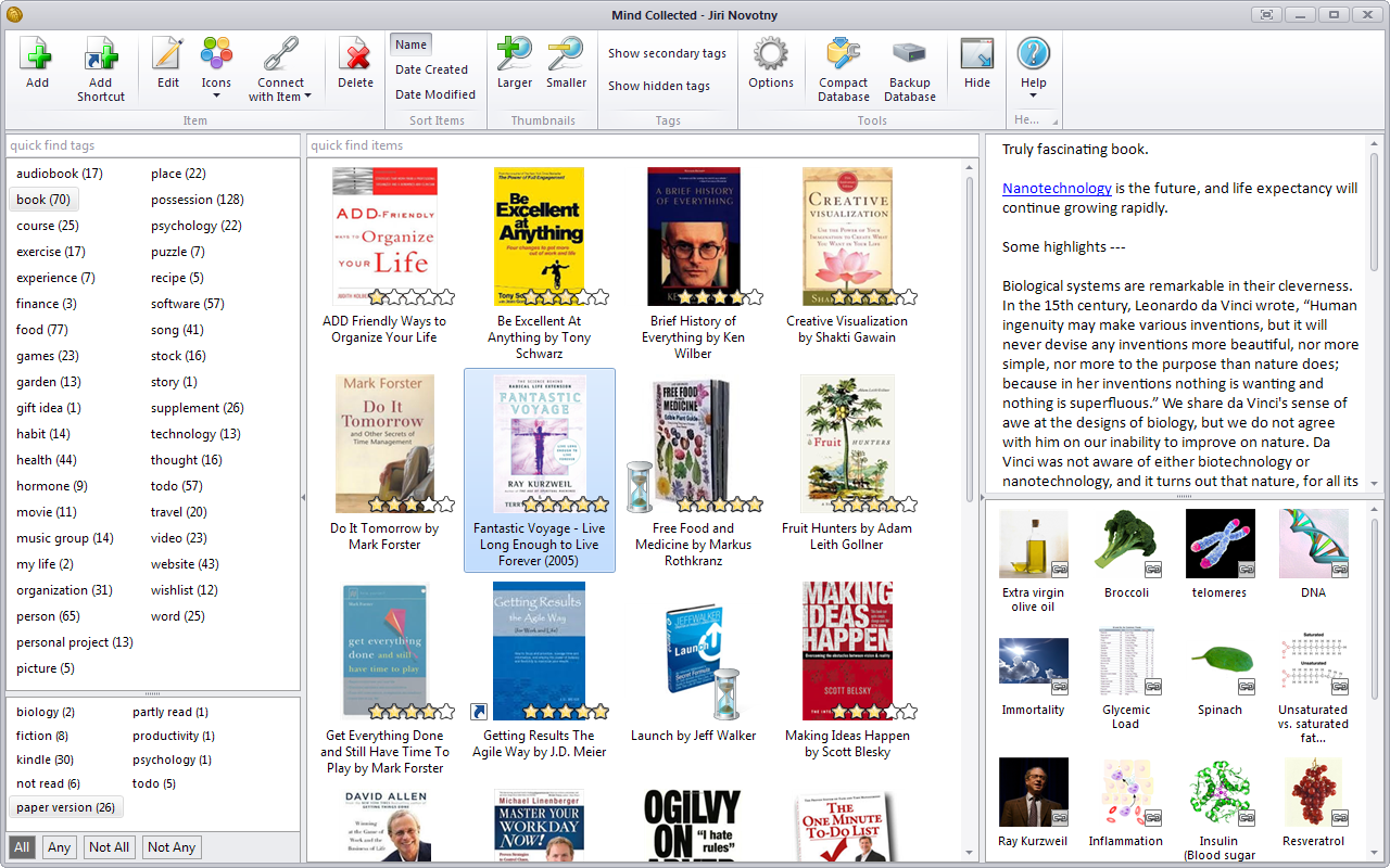 Mind Collected is a personal, visual database organized by tags. The database is used to store everything important that interests you and that you need for your work. Each object in the database has a picture, a name, a tag, a note and a contact. The tool can automatically search and download images for your objects from the internet, or you can use your own photos.