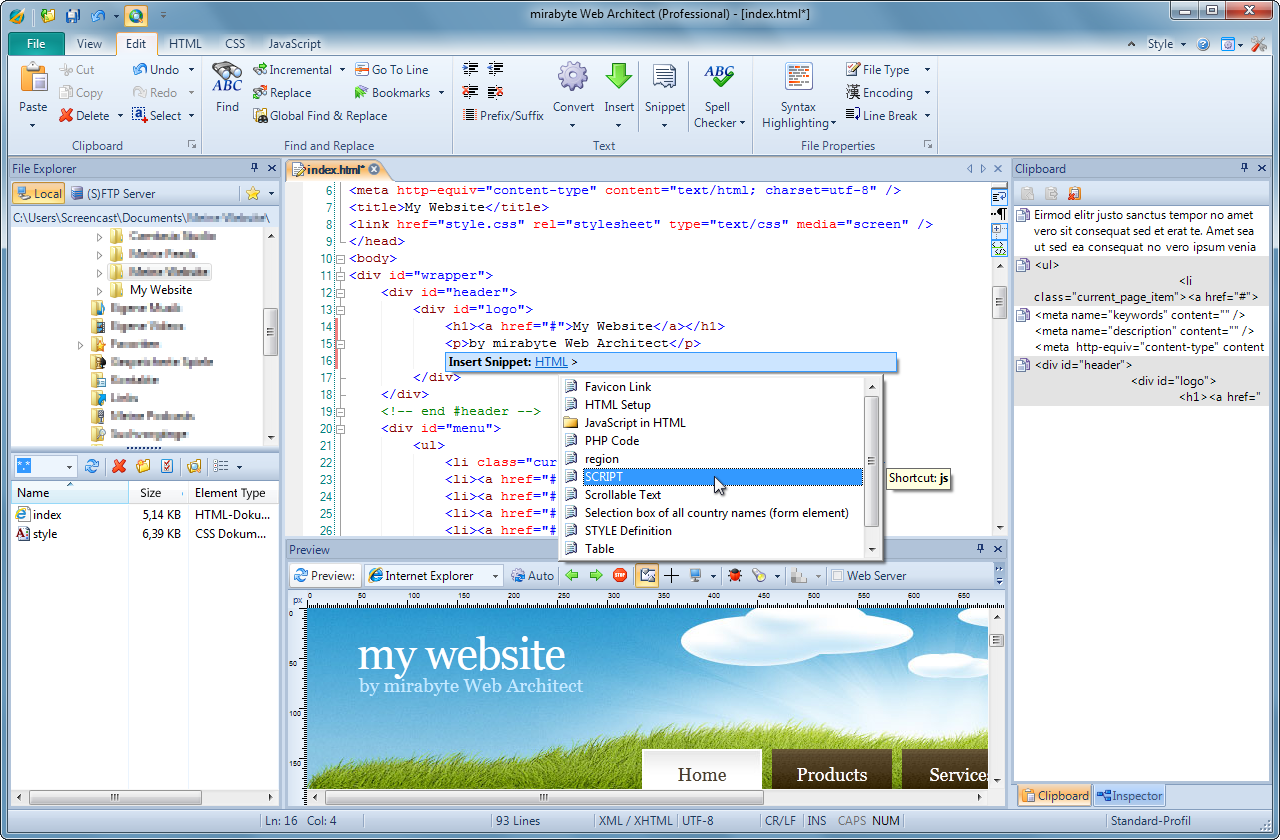 mirabyte Web Architect is a professional solution for creating modern websites, homepages and web applications. There is a source code editor (HTML5, CSS3) with the possibility of enriching the site through JavaScript or PHP code.