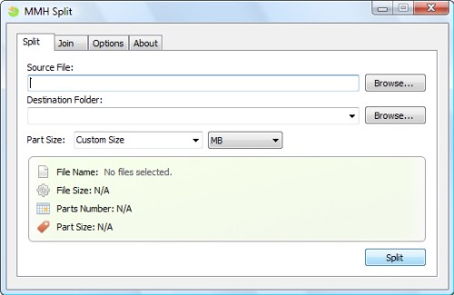MMH Split is a very simple utility for splitting large files into smaller ones and vice versa.