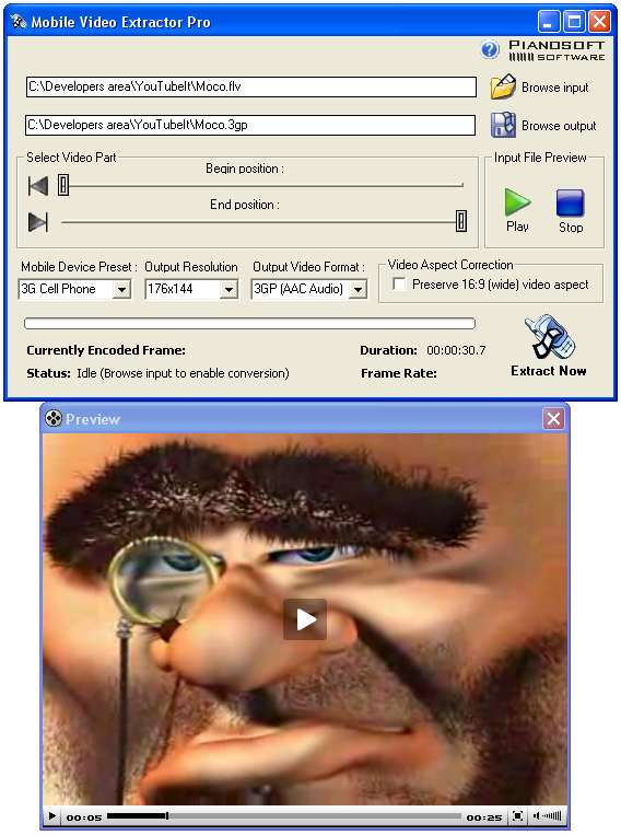 With Mobile Video Extractor, the user can easily extract a favorite part of the video and convert it into a suitable format for playback on your mobile device (3GP, iPod, iPhone, PSP, Zune). It offers a friendly and intuitive interface with the ability to view the video and convert its content easily and quickly.