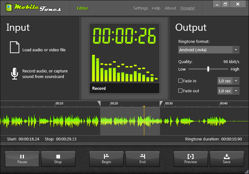 MobileTones is a tool that helps you create your own message and ringtone sounds for Android, Apple iPhone, BlackBerry and Windows Phone. You can create ringtones from audio and video files, or alternatively record something via microphone or Line-In. You can even create ringtones from your DRM music files, or from web pages, thereby easily capturing the sound directly from your sound card.
