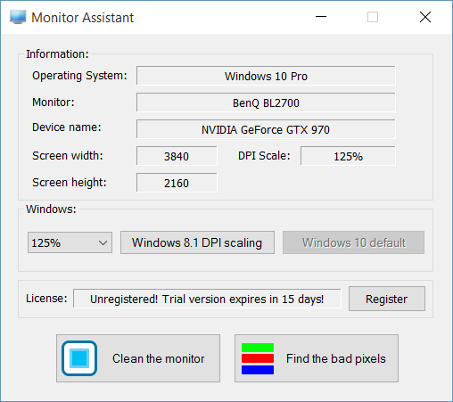 Monitor Assistant is a tool that detects bad pixels on the monitor and can also easily solve the DPI problem. There is a pair of buttons. The first button allows you to switch to a DPI scaling setting taken from an older version of the system - Windows 8.1, the second button allows you to switch back to the default DPI scaling setting (typical for Windows 10).