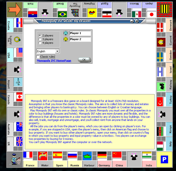 Monopoly INT is a dice board game designed for a resolution of at least 1024x768. The goal is to collect lots of money, possessions and let other players go bankrupt. Play Monopoly INT with custom or classic rules. The main twist in the layout is that streets are replaced by countries. The assumption is that you know the classic rules of Monopoly. In the classic game of Monopoly, you have to get all the buildings in one color. The rules of Monopoly INT are more dynamic and flexible, and you can also sell, trade, take mortgages and/or collect rent from anyone who gets on your property. You can't play this version of Monopoly against a computer or on a network, but you can play with human players on a single computer.