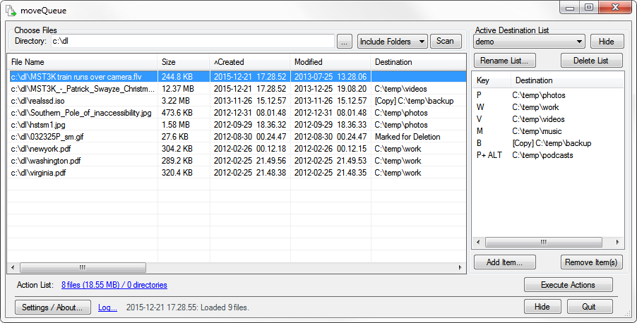 moveQueue is an app that makes working with files easier. It allows you to move, copy or delete files with single keystrokes. Just select in advance which files from the source location to move or copy and specify which folders to put them in. Selected items from the source directory can also be deleted. With this program, you don't have to perform all three actions one by one, but queue them up.