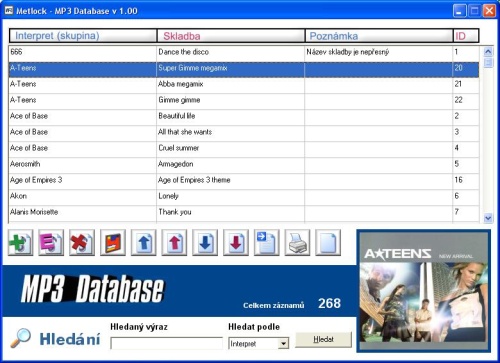 When you start the program, a window will appear with a list of your MP3s.Below this window there are buttons that allow basic functions for creating your database.These are buttons such as add new record, edit selected record, remove record, etc.At the bottom of the program there is a Search section where you can enter a term, specify what you are looking for, whether it is an artist, song or note, and use the search button to start the search.Which is very useful.For example, if you want to find out if you already have this or that song in your database, etc.But back to records.Adding a new record is simple.After clicking on the Add Record button, a window will appear in which you enter the Artist, song and note, if any.Then the save button will save your record to the database and you can add more.In addition, you can also assign a picture to each of your records or print all your records.The maximum number of records is 10,000,which is quite a lot.You can also sort each record alphabetically in ascending or descending order.However, the program can't handle Czech characters and so after sorting alphabetically it happens that, for example, the band Cechomor doesn't fit after the letter C.So it's better to name the band Cechomor for proper sorting.The maximum number of characters for the artist name, song name and notes is 30,which is not a lot.So sometimes it can happen that you can't fit the whole song name and so on.