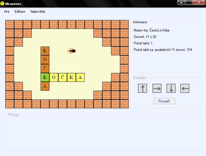 Unlike the Sokoban game, the blocks here are labeled with letters and each must be moved to a target position marked with the same letter. Control is not only possible using the arrow keys, but it is also possible to create a sequence of commands for the ant character to move according to. The rules of the game are described in more detail in the tutorial for the program. It is possible to create custom levels for the game using the editor.
