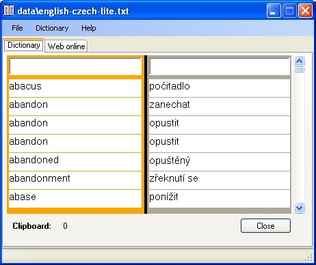 The program uses local databases and an online dictionary. Reversible dictionary works with databases in UTF-8 encoding. Inserting text into one of the top editors will automatically search for the word in the dictionary. Clicking on an edit with the corresponding translation will insert it into the clipboard. Change the database from the menu "Dictionary->english-czech-lite.txt" etc.