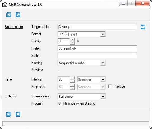 MultiScreenshots is a Windows program that allows you to take multiple screenshots automatically. You can set a time interval of 10 seconds or more. You can capture the whole screen or just the visible parts.