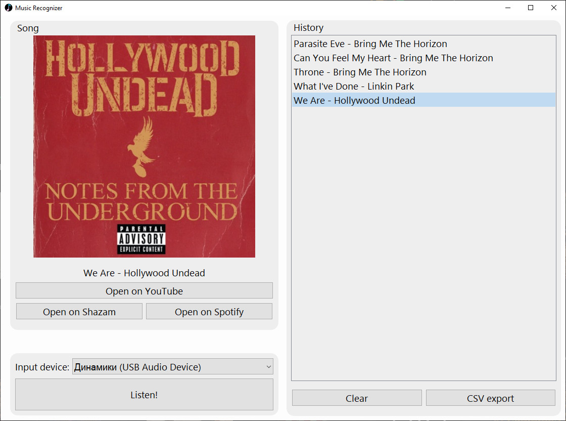 - Allows the user to play the song on YouTube, go to Spotify or open its detail on Shazam