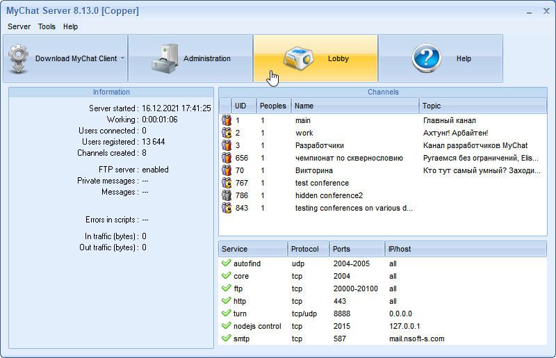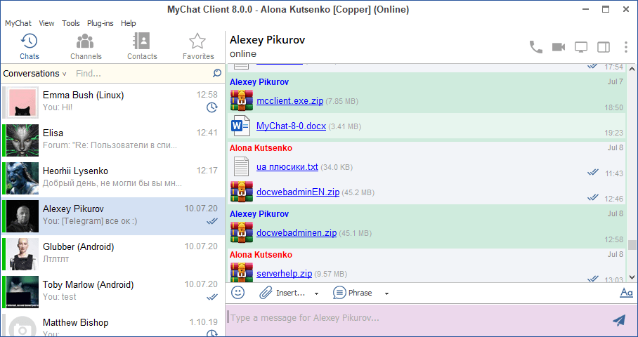 MyChat is a client/server chat application designed for sending messages and exchanging files within an office or company. It works both within the company network and over the Internet. This will make communication between your employees easier and faster and provide the necessary security in this communication. All data is under your own management on your own chat server.