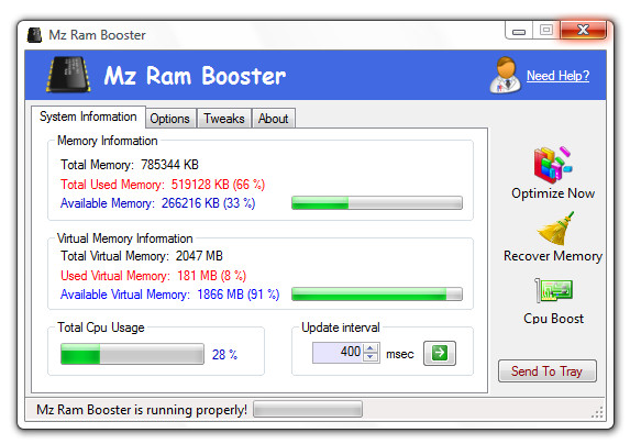 Mz Ram Booster is very easy to use. Just launch it and let it run in the background. The program takes care of everything else.