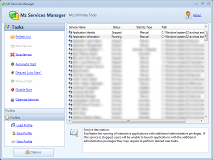 Mz Services Manager is an easy-to-use application that helps you get control of Windows services. It allows you to create Windows service profiles based on what is appropriate for the user and load them at any time. It can also perform automatic tuning to improve computer performance.