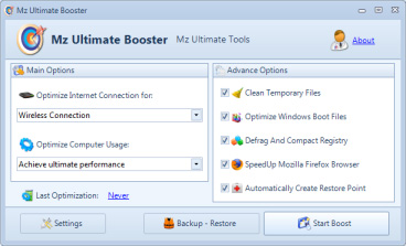 Mz Ultimate Booster optimizes system performance and Internet connection speed, prevents PC crashes and significantly reduces boot time.