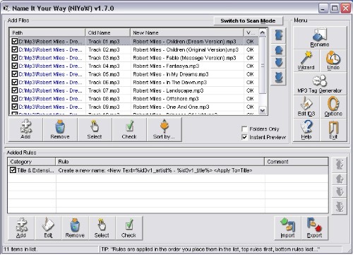 Name It Your Way (NIYoW) is a professional solution for bulk editing and renaming files and folders. It allows you to work with digital photos, documents, music files and other types of files and folders. The program also includes an ID3 tag editor for working with mp3 files.