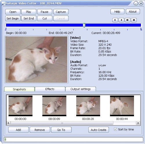 Naturpic Video Cutter is a powerful tool designed to split large AVI, MPEG, WMV, ASF, MOV, QT files into several smaller ones in different formats with the possibility of adding up to 50 different effects to your video.