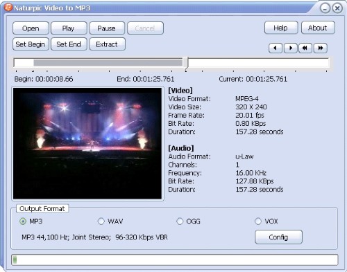 Naturpic Video to MP3 is a tool for extracting audio from video files to MP3, WAV, OGG or VOX format.