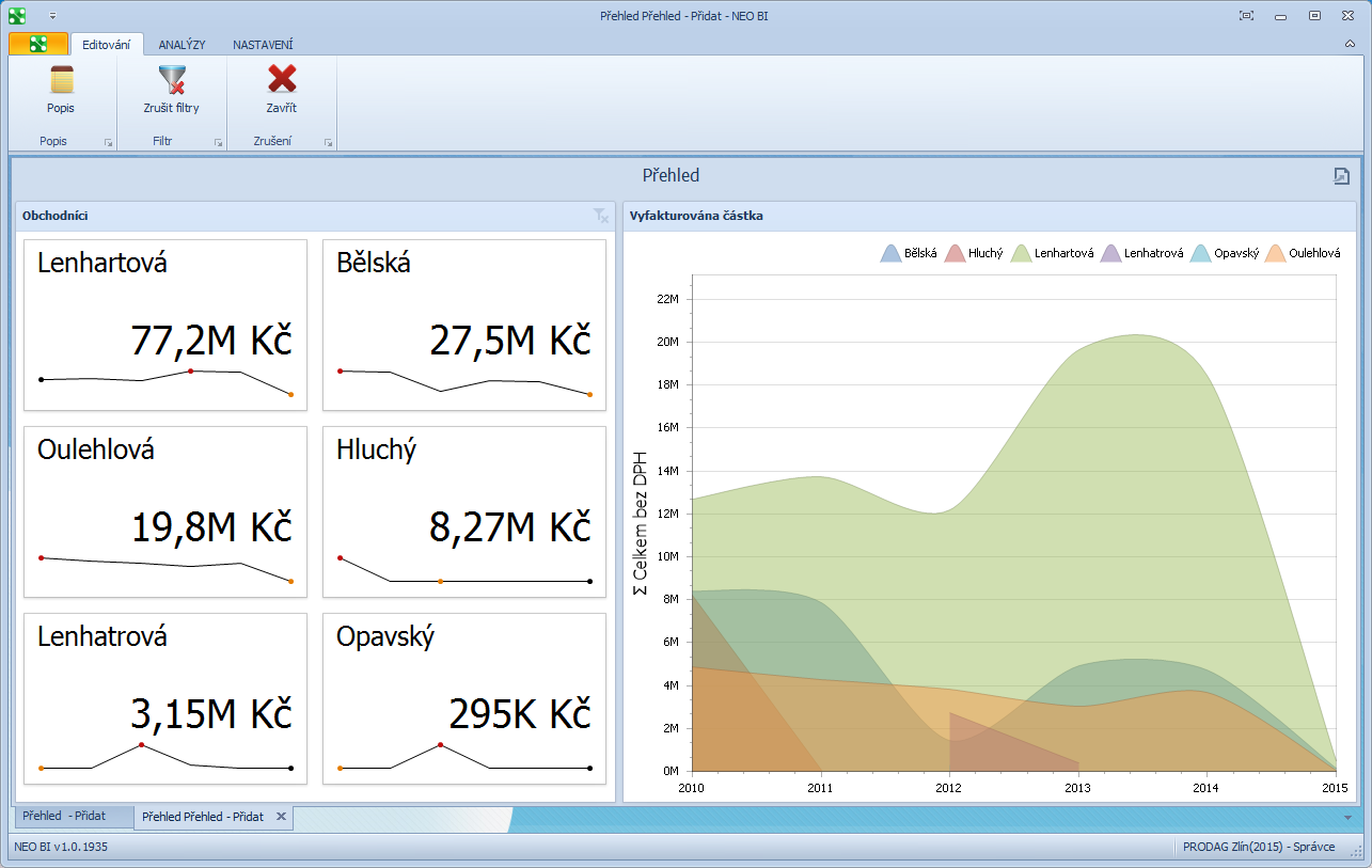 The only program you need to manage your company Neo Business Intelligence allows you to process your company's data from its accounting and display it in clear analyses and graphs. This allows you to manage your company much more efficiently and make the right decisions in a timely manner. With dozens of easy-to-understand analyses, you get a real picture of the state of your company, its sales results or the activities of your salespeople and branches. Thanks to NEO Business Intelligence, you can clearly analyze your company's data and extract important information from your accounting system that you can use to manage your business more effectively. The NEO BI software allows you to clearly display all company data related to sales, economic results or activities of individual dealers/branches. It offers managers a quick, understandable and always accurate basis for better company management. Presenting company data has never been easier - the software automatically connects to your accounting system. Thanks to NEO Business Intelligence, you can easily find out: - what was the total turnover or number of invoices in a given month, year, week? - which products brought you the most profit? - what were the revenues and costs by centres, activities and orders? - how do individual customers and selected regions stand out from each other? - are customers returning to us? - are your salespeople improving or stagnating? You can try NEO BI for free for 30 days. NEO BI is compatible with the accounting programs Pohoda, MRP, Money S3, Elisoft and Duel.