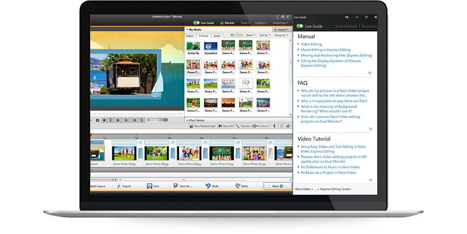 Simply upload your videos, photos or music from almost any endpoint device to your computer, drag and drop them onto the Nero Standard Start screen and you're right inside your personal multimedia studio! Enhance your videos with creative effects, set up transitions, insert stylish text, or make your job easier in no time by simply using one of the many templates. You can even export individual scenes from long videos in one go. This makes it easy to create, for example, a DVD-Video or Blu-ray disc with a menu or conjure up a first-class diashow of your holiday memories.